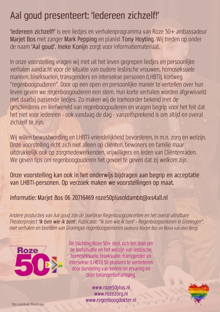 ‘Alles goed? Iedereen zichzelf?!’ is een programma van zanger Klaas Spekken, pianist Tony Hoyting en Roze 50+ ambassadeur Marjet Bos. Met uit het leven gegrepen liedjes en verhalen vragen zij op een open en persoonlijke manier aandacht voor de situatie van oudere lesbische vrouwen, homoseksuele mannen, biseksuelen, transgender- en intersekse personen (LHBTI). Ze stellen de vraag of LHBTI-ouderen helemaal zichzelf kunnen zijn, zonder dat zij bang hoeven te zijn om te worden buitengesloten.